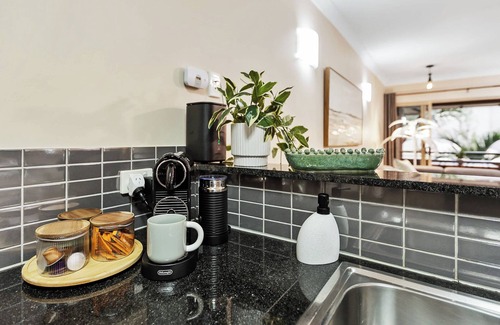 The kitchen is fully equipped with a gas cooktop, slow/pressure cooker, Nespresso machine, Breville toaster, and kettle, plus all the cookware and utensils you need. Enjoy meals inside or out on your private balcony, which has views of tropical gardens and pools.