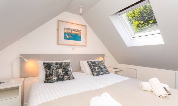The newly converted flat has been furnished in a comfortable colourful and contemporary style by owners, artist and architect Jean and Martin Farrell, the apartment boasts a spacious bedroom, living room, kitchen dining area and bathroom with walk in shower.