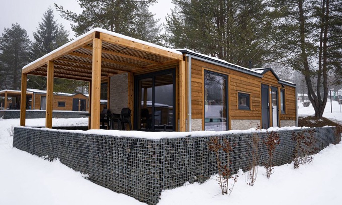 "Panorama Lodge 4", 3-room bungalow 60 m2, on the ground floor. Cosy furnishings: living/dining room with dining table, TV and air conditioning. 1 room with 1 double bed. 1 room with 2 beds. Open kitchen (dishwasher, Gas stove, kettle, electric coffee machine, combination microwave). Shower/WC, sep. WC. Heating, electric heating, gas heating. Terrace. Terrace furniture. View of the mountains. Facilities: Internet (WiFi). Parking (1 car) at the house. Please note: non-smokers only. The property is one of a type of property or apartment. Bookings accepted for holiday purposes only. A deposit of 100 EUR per person can be charged on site.