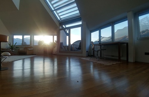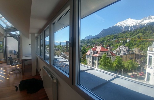 Bright and spacious two storey 160m2 Architect-Penthouse in Saggen, close to city center, the greenest district of the city. It takes approx. 10 min to walk to the city-center through the Hofgarten-Park or along the River Inn directly to the old city. The Living-room with a west-faced Terrace- overlooking Innsbruck and Inntal-Valley to the West with a panorama view to mountains and a stunning view to the very close-located imposant mountain range “Nordkette" with a sunset-view throughout the year ,