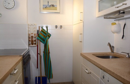 The modern kitchen is equipped with a full size fridge, gas cooker and oven, dishwasher, and Lavazza Mio capsule coffee machine. There is a separate lounge with TV and dining room with sea view. The very large private sun deck overlooks the beach and accommodates outdoor dining for 8 people, with huge umbrella and BBQ. There is a further garden and secure bicycle storage also overlooking the sea. Parking space for one car is at the rear of the building.