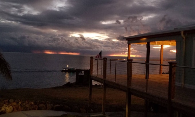 Located at the end of Flamingo Point Road, surrounded on 3 sides by the Caribbean Sea, on ~1 acre of property. The home is well off the road, very private and no drive-by traffic. On Flamingo Point you will hear only the sounds of nature and the waves crashing against the rocks below. Our property offers a large grassy area and plenty of space to park/turn around - highly unique feature than other island properties - and lots of room to play outside. There is an outdoor shower on the lower level. Expansive views of the sunsets, St. Croix ~45 miles to the south, Vieques/Culebra/Puerto Rico to the west, and the lights of St. Thomas to the west and northwest.