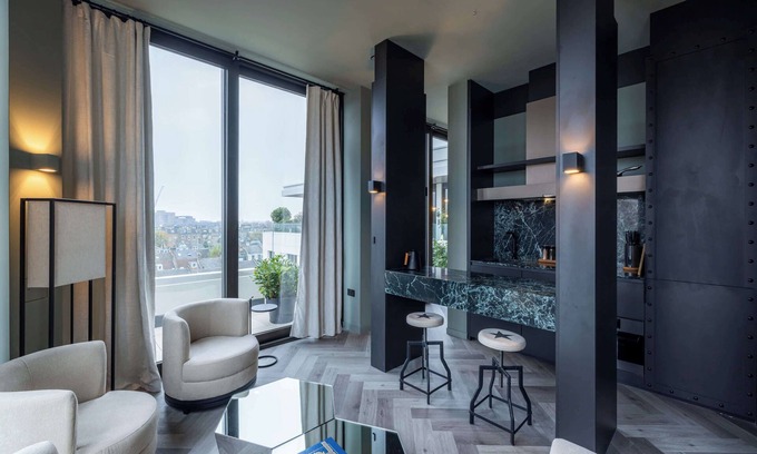 Welcome to The Haydon's exclusive panoramic penthouse apartment, an exceptional retreat located on the top floor, designed for those who seek a sophisticated stay with remarkable views. This spacious, corner studio features expansive floor-to-ceiling glass walls along the front and side, flooding the space with natural light and offering panoramic views over Battersea and the London skyline.