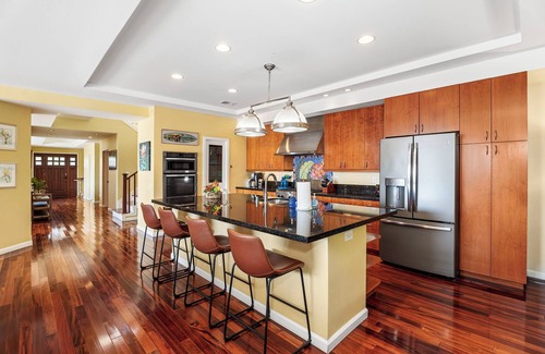 The open kitchen is anchored by a central island with bar seating, surrounded by rich wood cabinetry and granite countertops. Stainless steel appliances, a gas range, and abundant prep space make it easy to create everything from fresh poke bowls to gourmet dinners.