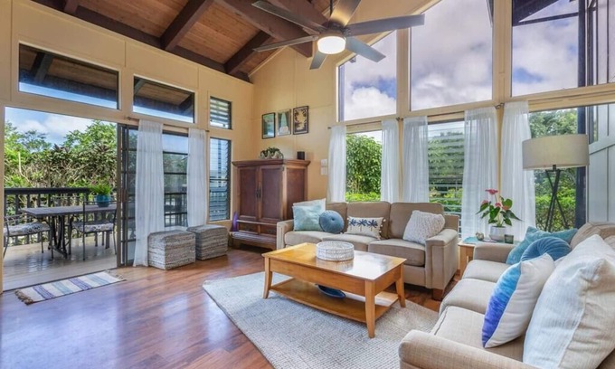 The condo itself is a spacious 1,500 sq/ft townhome, designed with island flair and all the comforts of home. It includes two queen bedrooms, one king bedroom, and an open loft with a queen sleeper sofa—plenty of space for families or groups. Wood floors throughout give the home a clean, cool feel, while vaulted two-story ceilings with plantation-style beams create an airy, open atmosphere. Island-style louvered windows allow for excellent airflow, maximizing the cooling trade winds. The kitchen has been beautifully remodeled with granite countertops and maple cabinets and is fully equipped for everything from casual breakfasts to gourmet dinners. Local art, including Troy Carney’s interpretation of the Nā Pali Coast in the dining room, adds a personal touch that reflects the beauty of the island. Sustainability is a key feature here as well, with a solar electric system providing green energy and a solar water heater ensuring plenty of hot water while reducing environmental impact.