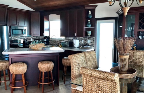 The home has 1 large master bedroom with a king size bed and a large bathroom, with private access to the beach. The 2nd bedroom with a queen size bed and a full bathroom with view to the ocean. The 3rd guest bedroom has a queen size bed and 1/2 bath. A large laundry room with Iron, washer and dryer. Fully equipped kitchen with counters, dinning table, a bar with wine cooler.