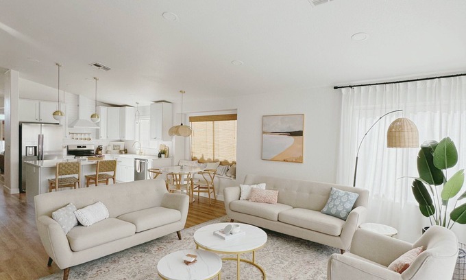 Discover a coastal inspired Paradise in Peoria, beautifully curated to give you a serene retreat. This charming house offers 3 cozy bedrooms and 2 full bathrooms. Relax and unwind by the private pool after a day of exploring all that the surrounding area has to offer. Located centrally, you'll be close to bustling sport stadiums, premier shopping centers, and exciting entertainment venues. Whether you're here to explore or unwind, this home offers a trendy, convenient base for your stay.