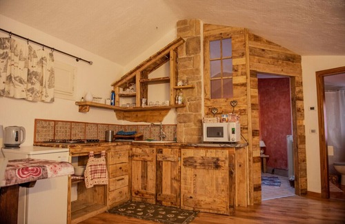 Al primo piano, invece, l'appartamento è dotato di una cucina attrezzata, un bagno e una camera matrimoniale, ideale per due persone o per chi preferisce la comodità di una cucina.