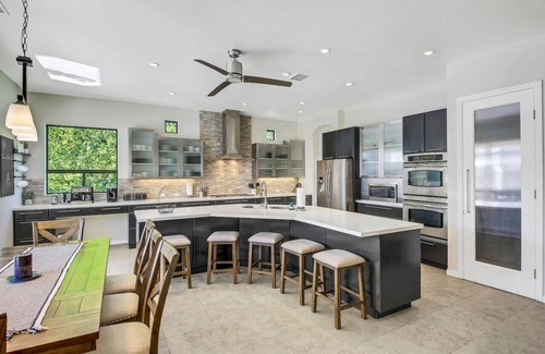 Embrace the desert-themed artwork that adorns the walls of this stunning five-bedroom oasis. The great room features a 75` Samsung smart TV and high-speed 1-Gigabyte Wi-Fi for seamless entertainment with cable/satellite TV. Each spacious bedroom comes equipped with its own TV for added convenience.