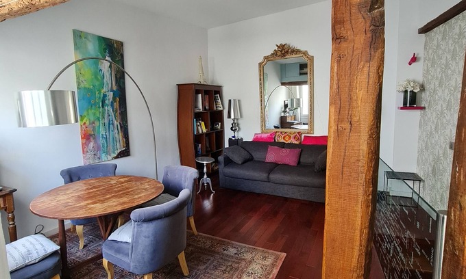 Ideally located in the historical heart of Paris, a few meters from the Seine and St.Michel / Notre Dame, duplex apartment 4th and 5th floor. It is situated in a very quiet half pedestrian street, a few meters from the joyful and festive atmosphere of the Buci street with its coffee shops terraces, street concerts, etc....