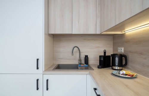 Park Źródliska Superior Apartment features a stylishly decorated living room with a sofa bed and kitchenette, a bedroom with a comfortable double bed, a bathroom, and a spacious balcony, perfect for enjoying a morning coffee or an evening glass of wine. The apartment offers a range of amenities to ensure a pleasant stay, including free Wi-Fi, a TV, washing machine, iron, hairdryer, fridge with freezer, induction hob, dishwasher, oven, microwave, coffee maker, kettle, and a full set of kitchen accessories.