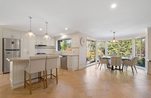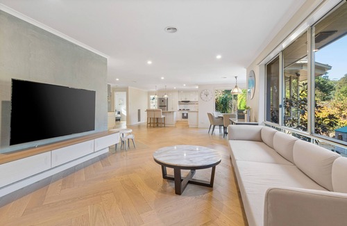 Park Oasis offers a peaceful atmosphere with lovely views, making it the perfect place to unwind. Step outside to enjoy the outdoor dining area for 8 people, with electronic blinds for extra comfort. The spacious gardens are perfect for kids to play and kick a footy or soccer ball, while swings, a small cubby house, and climbing items keep them entertained. For the adults, a small firepit and vegetable garden add to the charm of the outdoor space. At night, you may even spot kangaroos and deer from the home, adding a touch of nature to your stay.