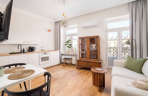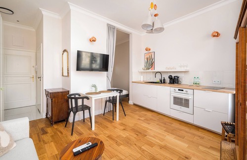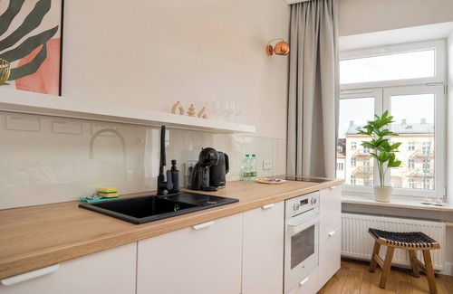 Park Praski Deluxe Studio is a stylishly designed apartment featuring a living room with a sofa bed and a comfortable double bed, a kitchenette, and a bathroom. Guests have access to a range of practical amenities, including free WiFi, terrestrial TV, a washing machine, an iron, a hairdryer, a fridge with a freezer, a dishwasher, an oven, a Dolce Gusto coffee machine, a kettle, and kitchen accessories. Additionally, the apartment is equipped with air conditioning, providing extra comfort, especially on hot days.