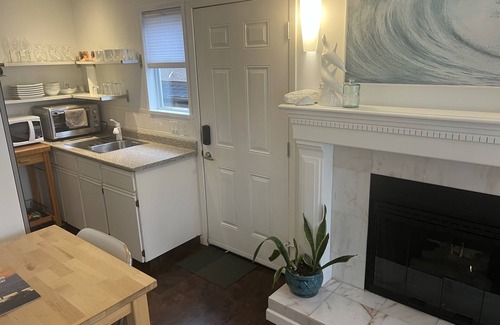 Cozy self contained studio with fireplace. View of mountains. Comfortable bed, with plenty of extra linens under a bay window with a view of the mountains. Fully stocked kitchen, custom made live edge wood desk, high top table to eat, fully stocked kitchen. En suite, washer and dryer and TV that provides Amazon and Netflix and Disney.