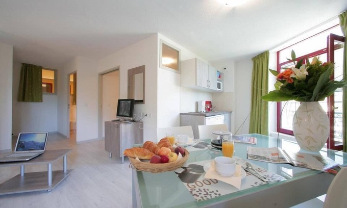 Situated in the heart of Allevard les bains and 300m from the shops, the residence Appart'Hôtel Le Splendid offers spacious apartments from 2 people studio to three rooms for 6 people. The residence (with lift) is situated next to the thermal baths, in a calm and relaxing harbor, 12kms from the resort of Collet d'Allevard (20 minutes by car or via a fee paying shuttle). Also nearby is the skiing resort of the 7 Laux, Pleynet situated at about 30 minutes. A lounge in one of the apartments in Le Collet d'Allevard, Alps, France is the ideal place for relaxing after sport, fitness activities or a rest cure as well as enjoying the surroundings. Surface area : about 35 m². Living room with bed-settee (140*190), flat screen TV. Bedroom with double bed (140*190). Kitchenette with kettle, coffee machine, toaster, dishwasher, microwave, 2 cooking rings, fridge. Shower room with hairdryer.