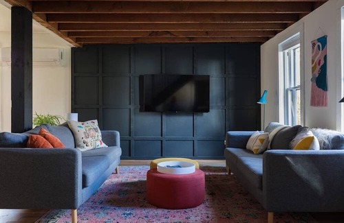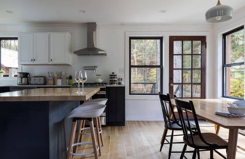 Built in 1850, this home has been renovated to enjoy all of the perks of modern amenities while retaining its original charm. You and your friends or family will love lounging in the open concept main living space, with windows that look out over the backyard, creekside deck and fire pit while enjoying the sound of the babbling stream coming through the windows. The living room includes two full size couches and upholstered ottomans with plenty of space to cozy in and watch something on the 55” Roku TV. There are plenty of free options on the tv or the option for you to log into your own subscription services to catch up on your favorite tv shows and movies. The dining room fits four comfortably for full meals or games at the property during your stay while enjoying the natural light shining in through the windows. The kitchen is well equipped with a gas cooktop and oven, toaster, dishwasher, microwave, fridge with an ice machine, coffee maker, milk frother, bar utensils and blender, as well as all the utensils, dishes, and pots and pans you could need!