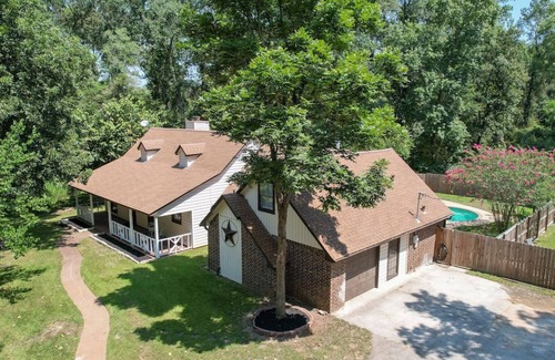 Stay here and you'll never want to leave! This 6-acre oasis within the city of Conroe features a winding road leading back to the beautiful ranch-style 5-bedroom, 3-bath home, and a private pool in the fenced-in backyard. Whether you're here for a private getaway or a large family gathering, this place has everything you need: Wi-Fi, large-screen TVs, coffee makers, pool accessories, and more. But most of all, the quiet and peaceful surroundings will soothe your soul...