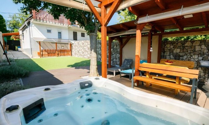 Siófok Sóstó 3 km from Siófok: Small, cosy semi-detached house "Particia", 2 storeys in 2023. In a quiet position, 700 m from the lake, from the beach. Private: property (fenced). Hot tub, garden furniture, barbecue. In the house: WiFi, air conditioning, washing machine. Roofed, parking at the house. Grocery 650 m, supermarket 10 km, restaurant 450 m, bakery 450 m, bicycle rental 2 km, railway station 800 m, grass beach 700 m, thermal baths "Igal" 65 km. Surf school 8 km, sailing school 7 km, tennis 850 m, riding stable 12 km, cycle lane 750 m, children's playground 700 m, fishing possibilities 1 km. Nearby attractions: Siófok-Sóstó Fishing Lake 1 km, Siófok Bella Zoo 2 km, Siófok Ferris Wheel 6 km, Sió Rally Car Park 15 km, Bebo Aquapark 3 km, BalatoniBob Theme Park 30 km.