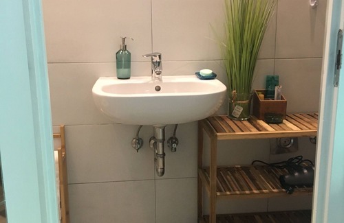 Quiet small apartment close to the city center, in a green area. There is a small garden in front of the ground floor apartment.There is a small garden in front of the ground floor apartment. You can park your car in the garden for free. Fast internet connection is provided. If necessary, clothes can be washed and dried. There are nice restaurants and playgrounds in the area, the city center can be reached in 20 minutes by bus number 5.