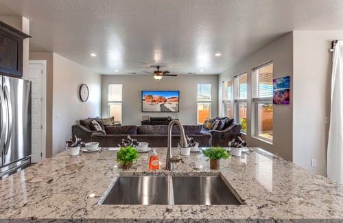 Spend your next Southern Utah vacation in luxury at Paseos near Sand Hollow Lake and Quail. This expertly designed home features a ping pong table and smart Tv, perfect for a family getaway with some fun activities for the kids. Spend your days exploring the natural beauty of Southern Utah, from the breathtaking sights of Zion National Park to the waves of Sand Hollow Reservoir. Enjoy the sunshine and fresh air as you hike through Snow Canyon or see a performance at Tuacahn Amphitheater. As you come home to your private retreat, cook some delicious food in the beautiful kitchen or on the provided BBQ grill. If the night gets chilly, gather around the spacious loft upstairs and play a game on the Xbox One. If the weather turns, challenge each other to a ping pong match, or watch a movie on one of the Smart TVs! No matter what you enjoy, Church Rock Retreat at Paseos is sure to have something for you!