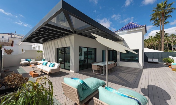 New-construction, fully-equipped independent villa with private sun terrace and shared swimming pool, located at the private yacht club Pasito Blanco, with wonderful views of the port and the sea, at walking distance from the Pasito Blanco beach, and with all services available for a perfect holiday in the south coast of Gran Canaria.