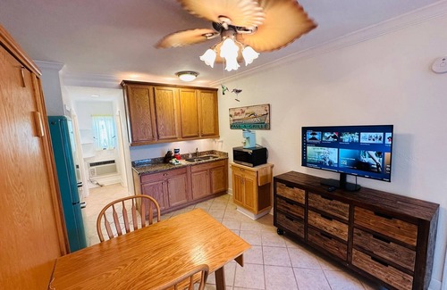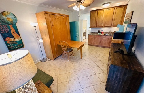 This adorable unit has all the conveniences you need for a beach getaway including a retro fridge, Keureg, combination convection oven/microwave, portable hot plate burner and all the utensils, a walk-in shower, internet, cable, and smart flat screen TV. The building includes laundry facilities.