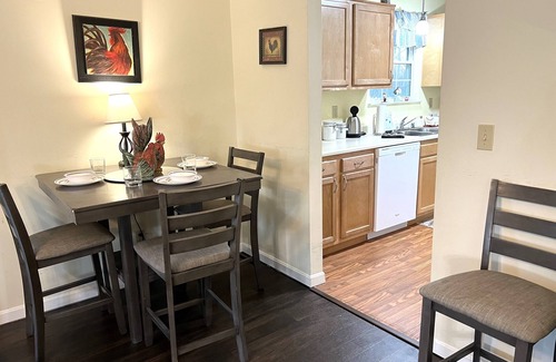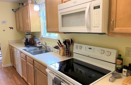Two comfortable first-floor bedrooms await you, each furnished with two cozy pillow-top queen beds ensuring a restful stay. Enjoy the nightstands with charging station lamps, and fresh towels. We also offer additional essentials in case you forget anything. The master bathroom offers a shower with safety rails, and a new washer and dryer were added in 2022. Additional convenience is provided by the half bath.