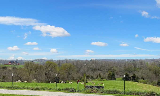 Discover the best of KY farm life in our charming 2-bedroom farmhouse. Nestled on 10 acres on a gravel lane next to and across from working farms, this retreat immerses you in breathtaking views. Experience rustic charm w/cozy beds, well-equipped kitchen, & luxurious bathrooms. Relax, connect with nature, and enjoy grazing farm animals along the lane! Book your unforgettable farm experience today and escape to the beauty of the countryside.