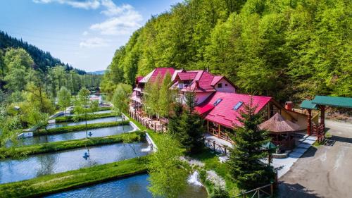 Pastravaria Bratioara in Cîndeşti provides accommodations with a garden and a shared lounge. There's a sun terrace and guests can access free Wifi and free private parking. At the guest house, the units have a wardrobe, a flat-screen TV, a private bathroom, bed linen, and towels. The rooms are equipped with heating facilities. A selection of options including local specialities, fruit, and cheese are served for the buffet breakfast. There is an on-site restaurant, coffee shop, and bar. You can play table tennis, darts, and tennis at the guest house, and bike rental is available. Guests can relax near the outdoor fireplace at the guest house. Sibiu International Airport is 103 miles away, and the property offers a paid airport shuttle service.