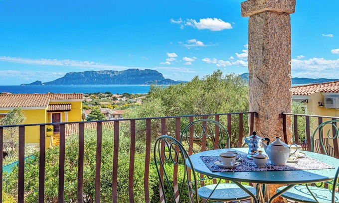 The house consists of a large living room with dining area with sea view, a kitchen, a complete bathroom with shower, a bedroom with a double bed and a second bedroom with 2 single beds (both bedrooms have sea views). The house is supplied complete with crockery, plates, glasses and linen for the beds and bathrooms. The living room leads to a large terrace covered by a wooden roof of approximately 12 m2, from which it is possible to enjoy a wonderful view of the sea and of the island of Tavolara, symbol of Olbia. It is possible to eat outdoors on the covered terrace. The apartment has a reserved parking space, washing machine, dishwasher, electric oven, microwave oven, iron, heating, hot/cold air conditioning ducted in all rooms of the house and satellite TV. The house is located 5 km from Olbia and the port, 9 km from the airport, 12 km from Golfo Aranci and a few minutes from Porto Rotondo, 30 minutes from Porto Cervo and San Teodoro. Within 1 km of the house there are bars, restaurants, pizzerias, a supermarket, a bakery and a hairdresser. The closest beach is located about 700 meters from the house and is Spiaggia del Pellicano.