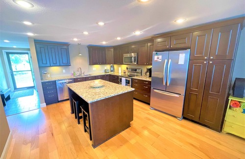 Upon entering our home, you’ll find the 1st guest bathroom to your left, laundry room, an additional refrigerator/freezer and garage entrance to your right, and guest bedroom number 1 offering a queen bed to your right. our fantastic chef-inspired kitchen features a large center island with a marble countertop and 2 counter height barstools to your left. The kitchen is stocked with pots, pans, utensils, silverware, glassware, potholders, our favorite cooking oils, an air fryer, a toaster, a crockpot, a blender, a Keurig with assorted K cups, paper towels, kitchen washcloths, dish soap, and dishwasher detergent. (we do have an outdoor 3 burner propane grill with grilling utensils) Walking through the kitchen you’ll find the west wall of the home is all windows boasting an incredible view of Paul Lake, offering unbeatable sunsets across the lake. In this space, we have a high-top dining table that seats 8 guests, along with a propane fireplace, comfortable living room seating for lounging, and wonderful lake views. Just beyond the lounge space is a comfortable sunroom on the main level featuring a large sectional offering a lovely place to watch TV on a 55-inch smart TV. This room does have a glass patio door with lake views. It also has a sliding barn door to close it off for privacy.