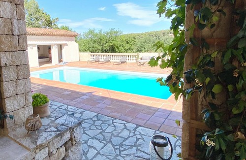 5 Bedroom Villa. Studio house next to large pool. 2 large Terraces, and open plan living room/ Kitchen/ Dining room. Bedrooms have air conditioning. All in a quiet setting with a valley view. Very close to villages, shops and restaurants.