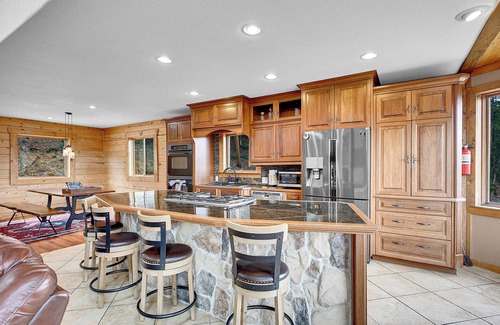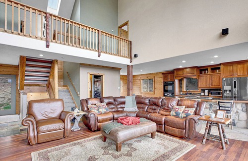 The Big Divide is the main home on the ridge, with over 4,300 square feet of living space and three bedrooms. Vaulted ceilings, exposed brick, and panoramic windows create a space that feels grounded and elevated all at once. Cook in the spacious kitchen, hang out by the fireplace, or pour a drink and watch the sky shift behind the peaks. There’s a game room with foosball, Smart TVs, and plenty of seating for your whole crew.