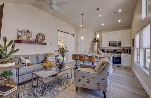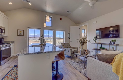 This charming Casita is perfect space for a couple. The name perfectly describes this homes décor! Sunsets and palms give the perfect feel for this beautiful St George getaway. The living area and kitchen is one open space. The kitchen is fully equipped and has a gorgeous island that provides seating for four. The living area is a perfect setting for relaxing and enjoying one another. Enjoy your favorite program on the flat screen Smart TV. The bedroom has a king size bed and a flat screen TV. You will notice the sunset décor continues throughout this home. The bathroom is separate and includes a washer/dryer unit.