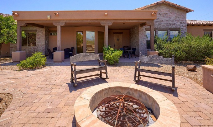 Comfortable house with peaceful beautiful desert views; front & rear patios both with fireplaces; outdoor kitchen with grill; private pool & spa; 2 home theater systems; 5 TV's - all with streaming services. Wood burning fireplace in living room; gas burning fireplace in Master Bedroom. Gated & walled private 7 acres property with 2 other buildings both well away from this (main) house. Wheelchair accessible.