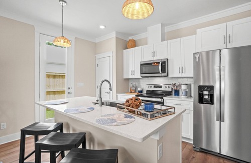 A true highlight of this retreat is its backyard sanctuary, complete with a private pool. This tranquil oasis invites guests to unwind beneath the Florida sun, offering a refreshing escape for both relaxation and rejuvenation. It's an idyllic setting for morning coffee or evening cocktails before planning a day of shopping or beach going.