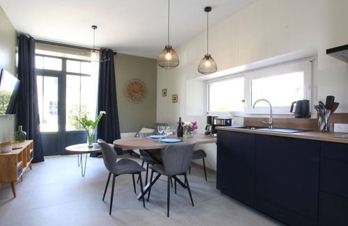 Detached single-story house. Close to the owner's house. Living room with wood-burning stove (TV, Internet). Fully equipped kitchen area (induction hob, oven, microwave, dishwasher, freezer compartment, espresso machine, filter coffee maker). Bedroom (1 bed 180x200). Shower room with WC (walk-in shower, hairdryer). Washing machine. Electric heating. Wood provided on request. All charges included except electric vehicle charging. Unfenced grounds. Gravel terrace in front of the house entrance. Garden furniture. Deckchairs. Barbecue. Parking. Bed linen and towels provided. Cleaning service optional. You will stay in the setting of this magnificent Cotentin farm (working dairy farm). The local white stone gives these buildings a certain charm. The location is peaceful and perfectly positioned near the beaches and famous D-Day sites. The stream below and the cows in the surrounding meadows also contribute to this rural setting. Two other cottages for 4 and 2 people are also available.