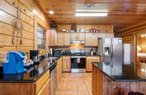 Welcome to Peaceful Pines, our charming cabin with self-check in! Our Modern log home is great for couples, families, honeymoons or retreats. Relax on the deck w/ a cup of coffee & take in the soaring pine forest around you. Front entry has windows floor to ceiling, large living area w/ sleeper sofa, rock gas fireplace & open concept flow into huge fully stocked kitchen. King sized log bed in master. Queen log bed in 2nd bedroom. Both bathrooms have tub/shower combo w/ granite counters. Full sized washer/dryer in cabin. Step out on the deck to the Hot Tub (drained/cleaned/filled after every stay) w/ privacy fence. Enjoy the playground w/ climbing wall/swing/slide. Relax by the fire pit & cook s'mores in the evening. We're surrounded by tall pine & hardwood trees in a fantastic neighborhood with high-end log homes.