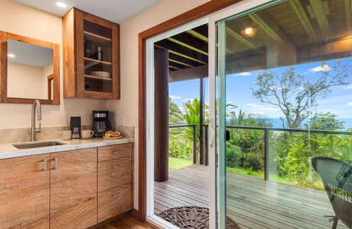 Get out of the hustle and bustle of downtown Kona and into your own private paradise. This suite offers privacy, ocean views, and acreage to explore. Enjoy the beauty of coffee trees, tropical fruit and nut trees, and the sounds of nature.