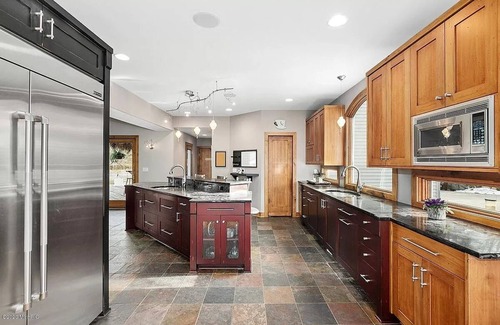 There is over 4500 sq. ft. of living space in the house. The open concept main level has a large, fully equipped kitchen with stainless steel appliances, a table for 8, a bar area with built-in barstools that seats an additional 5 (extra table and chairs in garage for use in the home), and a big pantry to store all of the goodies you purchase at the Holland or Grand Haven Farmer's Market. The family room has a 65-inch large screen TV and overlooks the deck and the lake. The study which doubles as an extra bedroom and a half bath round out the main floor.