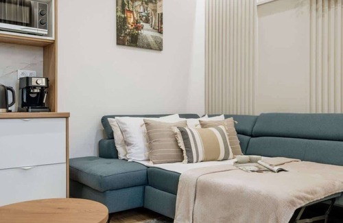 The apartment features a bedroom with a comfortable, large bed, equipped with professional hotel-quality bedding and towels. The living room is connected to the dining area and a kitchenette, which is equipped with essential appliances and utensils for preparing and heating meals, including kitchen tools and spices. A kettle and a coffee machine are also provided for your convenience.