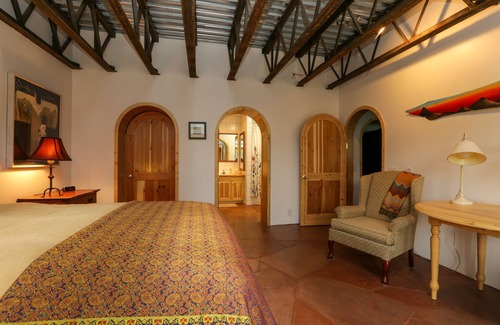 This one-level south facing passive solar home has flagstone floors throughout to store the heat while the welded bridgework trusses support a galvanized metal ceiling which in turn supports a living roof. The wood interior trim, cabinetry and arched doors took Frank a year to complete, making the house a visual treat.