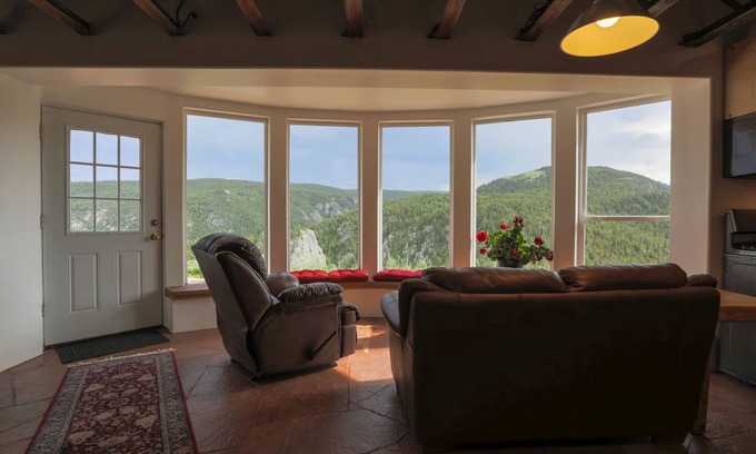 Seasonal climbers on the Dream Canyon cliffs provide ringside entertainment from the large front room bay windows.