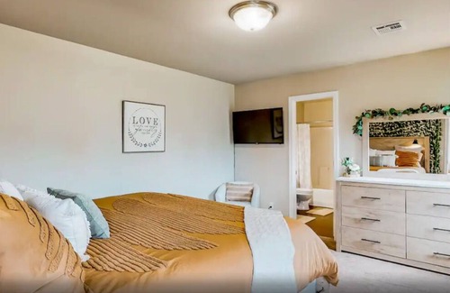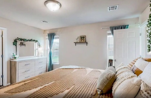 Discover the epitome of peaceful suburban living in this serene Broken Arrow neighborhood. With ample space to accommodate larger groups, this home provides a perfect retreat for anyone seeking a relaxing getaway. Whether you're looking to work remotely or unwind in the hot tub, this property caters to your every need. The four bedrooms include a master bedroom with a king bed, an attached full bathroom, and a walk-in closet, and three additional separate bedrooms - two with full beds and one with a bunk bed. Book your stay today and experience tranquility like never before!