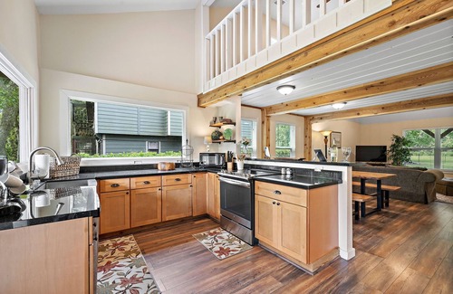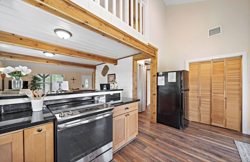 This peaceful, country-style home features an open, fully equipped kitchen with granite countertops and brand-new stainless steel appliances, plus new carpet, stylish wood flooring, and updated bathrooms. The kitchen opens to a breakfast area and a spacious living room with vaulted ceilings. Step out onto the new deck and enjoy beautiful views of the large backyard. The outdoor space feels like a private retreat, with lovely trees, wide open space, and a tranquil water view. Bring your fishing gear—airboats are welcome—and unwind. Kids can enjoy kite flying, fishing, and exploring the open yard. The home includes two downstairs bedrooms with queen beds, a convertible sleeper sofa in the living room, and an upstairs bedroom with another queen bed and a cozy loveseat in the loft.