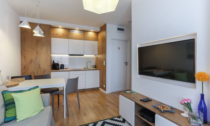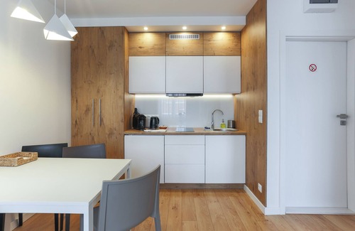 Cozy and comfortable apartment (~25 sqm) located on a side from the main street. There is no traffic around the building (courtyard view from one side and broad walking area from the other). The apartment is placed on the 2nd floor. There are electronic lockers for the doors with digital codes to get in, so there is no problem with late arrival or early departure. Codes are being sent via e-mail or text message the day before arrival and can be used for the entire stay. Doors are soundproofed for Your comfort. Fully equipped kitchen with fridge, freezer, dish-washer, capsule coffee machine, kettle, toaster, induction hob and everything you need for cooking & eating. Bathroom with the shower, hair dryer and towels. Wireless unlimited high speed internet available in the entire apartment for free. Living room with 47`` flat TV, connected to the Internet (YouTube, Netflix). Iron and iron bed is available, infant bad is available on request. Public parking is available on the courtyard (no reservations). A roundtrip airport shuttle is provided for a surcharge of 100PLN (available on request). Check-in is available at any time after 2pm, check-out is requested by 10am. City's noise ordinance from 10pm till 6am. Pets are not welcomed. Organising a party is not allowed.