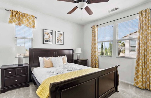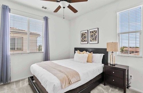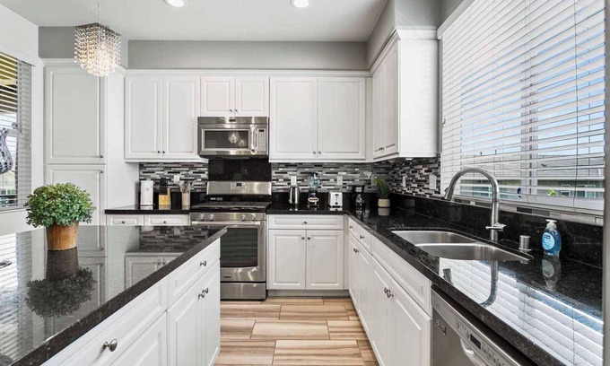 Welcome to Peacock Court Sanctuary, a premier living destination offering a blend of modern luxury and serene comfort. Located in the heart of Eastvale, California, this newly managed property is designed to cater to those seeking quality living spaces for short to medium-term stays, ranging from one to twelve months. Upon entering the Peacock Court Sanctuary, guests are immediately struck by the spacious and elegant layout, which combines contemporary design with homey touches that make the space welcoming and warm. The expansive living area is adorned with plush furnishings, stylish décor, and large windows that bathe the room in natural sunlight, creating a lively yet relaxing environment. The heart of the home, the kitchen, is equipped with state-of-the-art appliances, beautiful quartz countertops, and ample storage space, making it perfect for both quick meals and elaborate dinner preparations. Adjacent to the kitchen is the dining area, where residents can enjoy meals overlooking the beautifully landscaped backyard. Peacock Court Sanctuary offers three luxurious bedrooms, each thoughtfully designed to maximize comfort and privacy. The master suite is a true retreat, featuring a large en-suite bathroom complete with dual sinks, a soaking tub, and a separate shower. Each additional bedroom is equipped with comfortable bedding and ample closet space, ensuring a restful sleep.