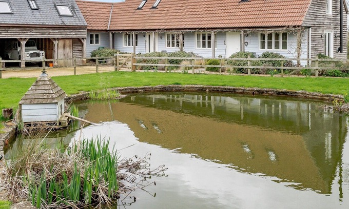Both sleep up to five people, with three bedrooms and three bathrooms in each cottage. On the ground floor is a queen bedroom with adjacent bathroom with cubicle shower, on the first floor there is a double bedroom with en-suite shower room and a twin bedroom, as well as a large family bathroom. Each cottage has a large, well-equipped kitchen/dining room, perfect for enjoying a well-cooked evening meal with views over the fields beyond. It’s a great place to gather and chat and drink whilst dinner is being prepared! Both cottages have separate living areas with comfortable seating, Freeview TVs and a wood burner, perfect for those cosy nights in. The cottages have a shared garden with private BBQ and outdoor seating per cottage. There is also a separate utility room that both cottages have access to with a washing machine and tumble dryer. The owners provide a starter pack for the logs and BBQs, they also have cots and highchairs that can be requested. For your furry friends, the owners have a large utility room where there are spare dog towels, poo bags and dog bowls, and can also provide beds for the dogs. There is a hose just outside the utility area where you can wash and dry your pets after a wet and muddy walk; all dogs staying in the cottages must be kept downstairs. There is a large pond in front of the cottage which is fenced off but not enclosed; it acts as a boundary between the cottage and the owner’s home. The pond is 1.5m deep in the middle and 40cm shallow at the edge, so guest with dogs and children must take responsibility and not leave them uattended.