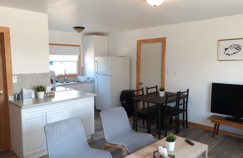 Full kitchen, fridge, microwave, stove, oven, kettle, toaster, utensils, staples, coffee maker, smart TV, private backyard, picnic table, Adirondack chairs, fire pit.
