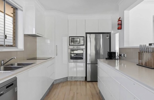 Includes a full-size fridge, toaster, kettle, microwave, rice cooker, sandwich press, electric egg cooker, steamer, mixer, Nespresso coffee machine, oven, and electric stovetop.
